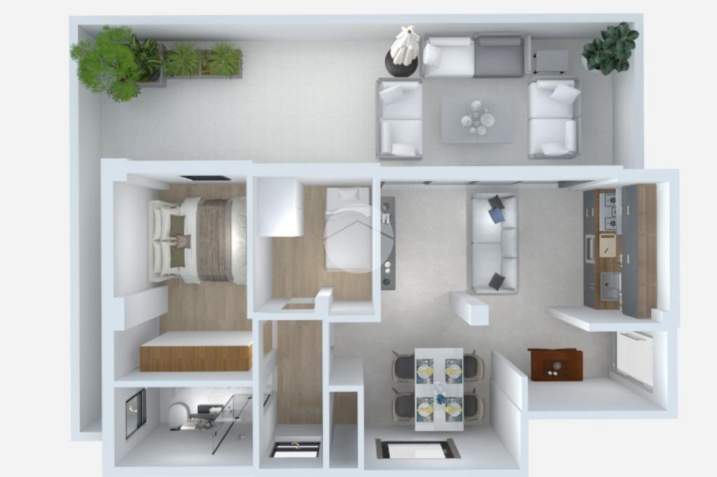 L’appartamento si apre su una luminosa zona giorno con ingresso su cucina e soggiorno, uno spazio accogliente e funzionale. La zona notte è composta da una camera matrimoniale, una cameretta, un bagno finestrato e un pratico ripostiglio.